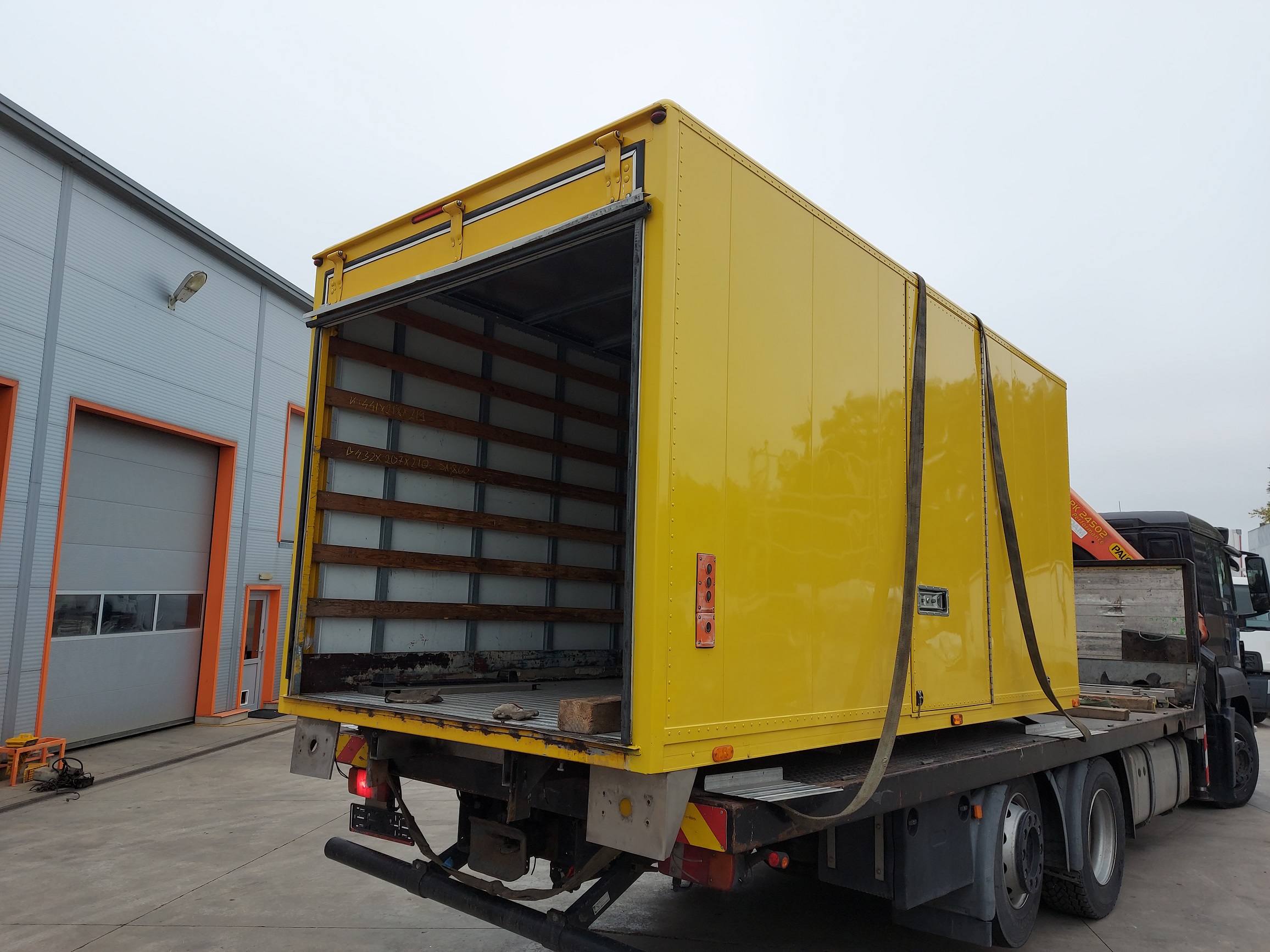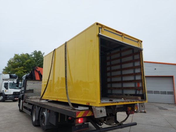 DOBOZ FELÉPÍTMÉNY OLDALAJTÓVAL, KÜLSŐ MÉRET: 4.41 x 2.18 x 2.19 m, BELSŐ MÉRETE: 4.32 x 2.07 x 2.10 m, SEGÉDALVÁZ SZÉLESSÉGE 860 mm. IGÉNY SZERINT FELSZERELVE IS!